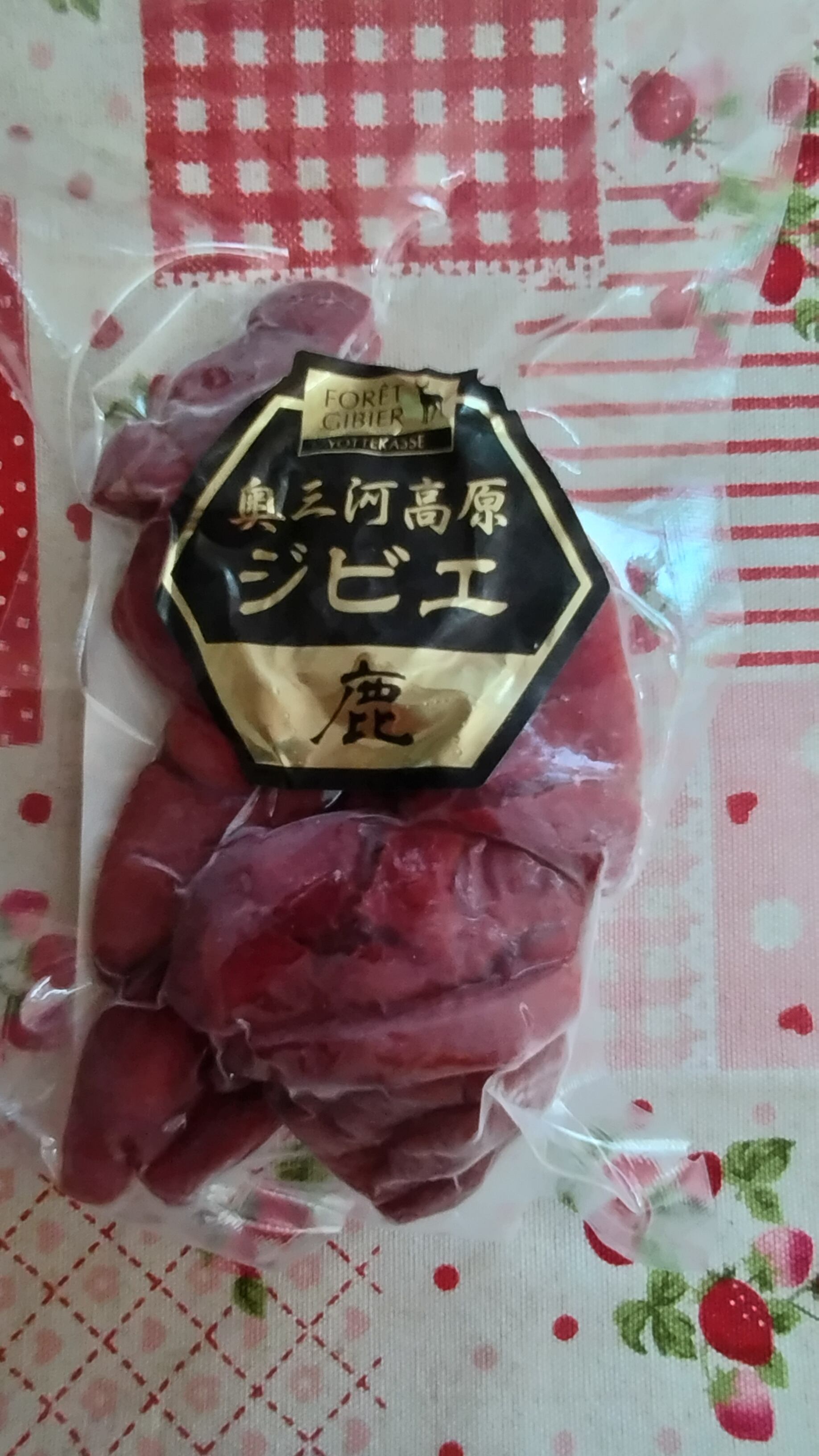 【原材料名】鹿肉、岩塩、糖類(砂糖・ブドウ糖・水あめ)、リン酸塩(Na)、酸化防止剤(ビタミンC)、調味料(アミノ酸等)、発色剤(亜硝酸Na)、香辛料